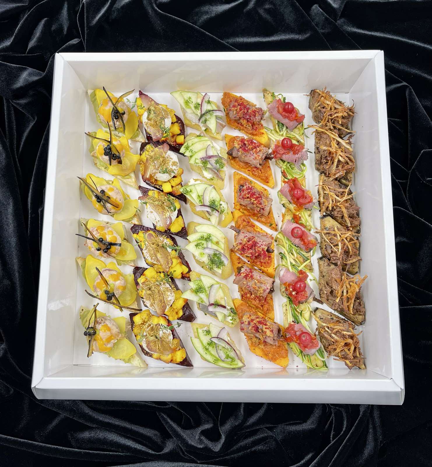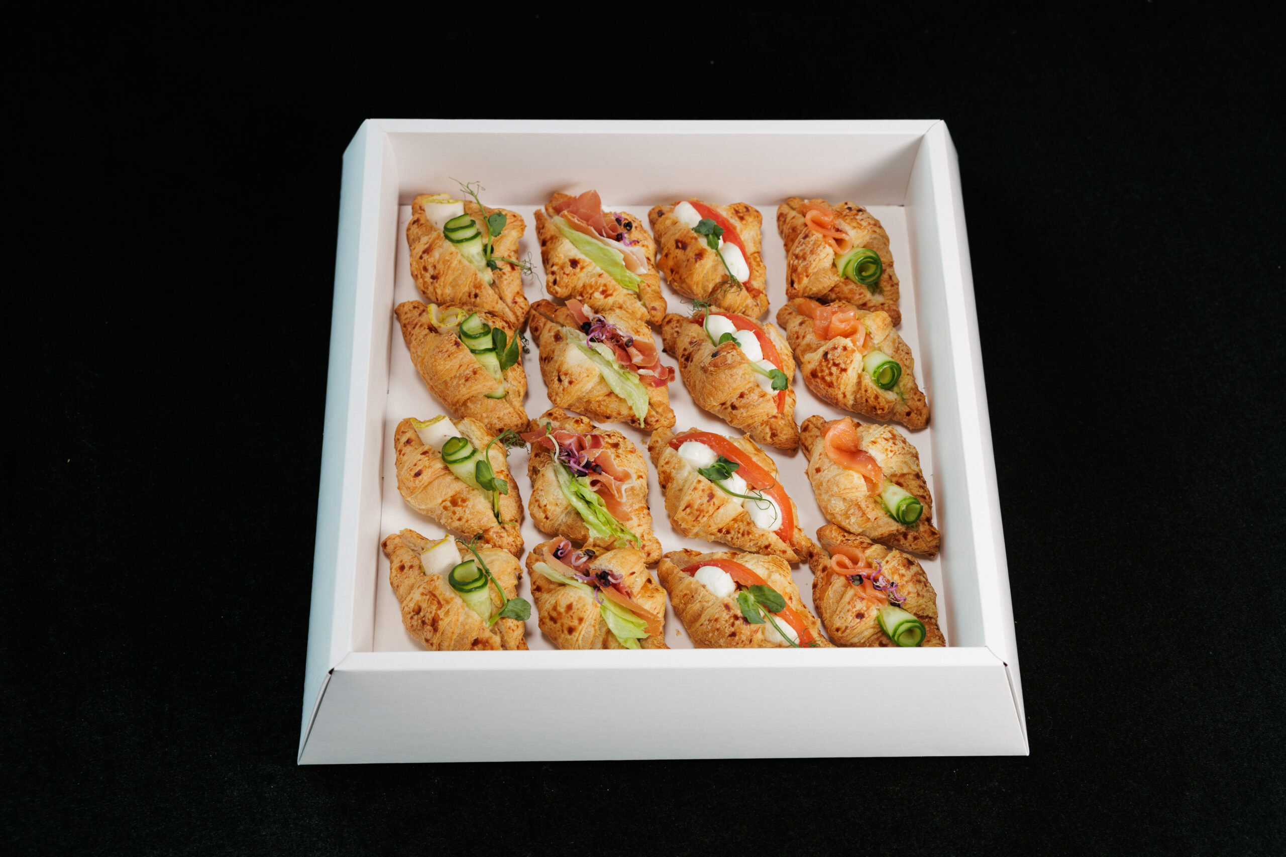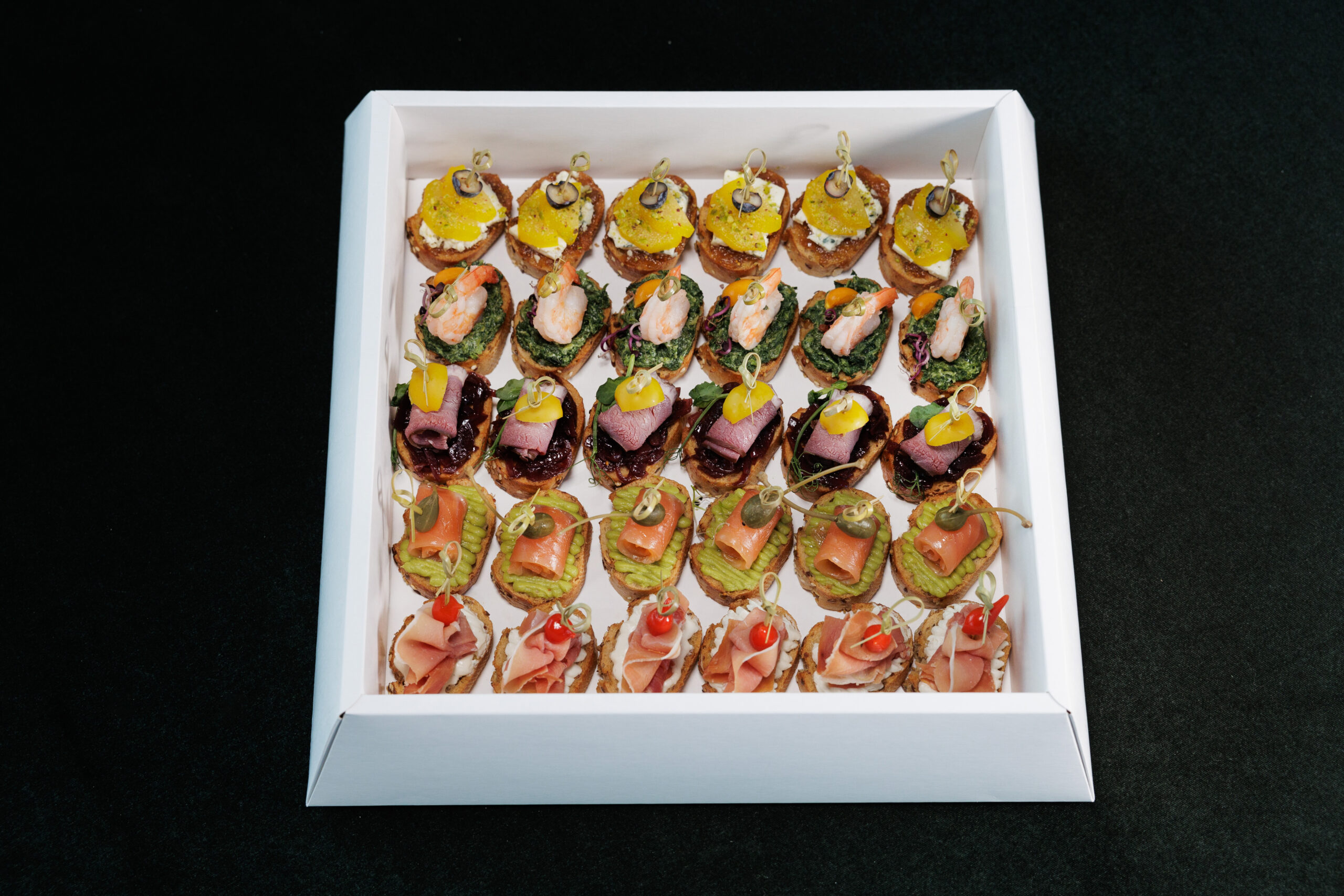 Elegantiškai išdėstyti vieno kąsnio užkandžiai – įvairių skonių derinys (mėsiški, žuvies ir vegetariški variantai). Puikiai tinka furšetams, vestuvėms ar gimtadieniams.