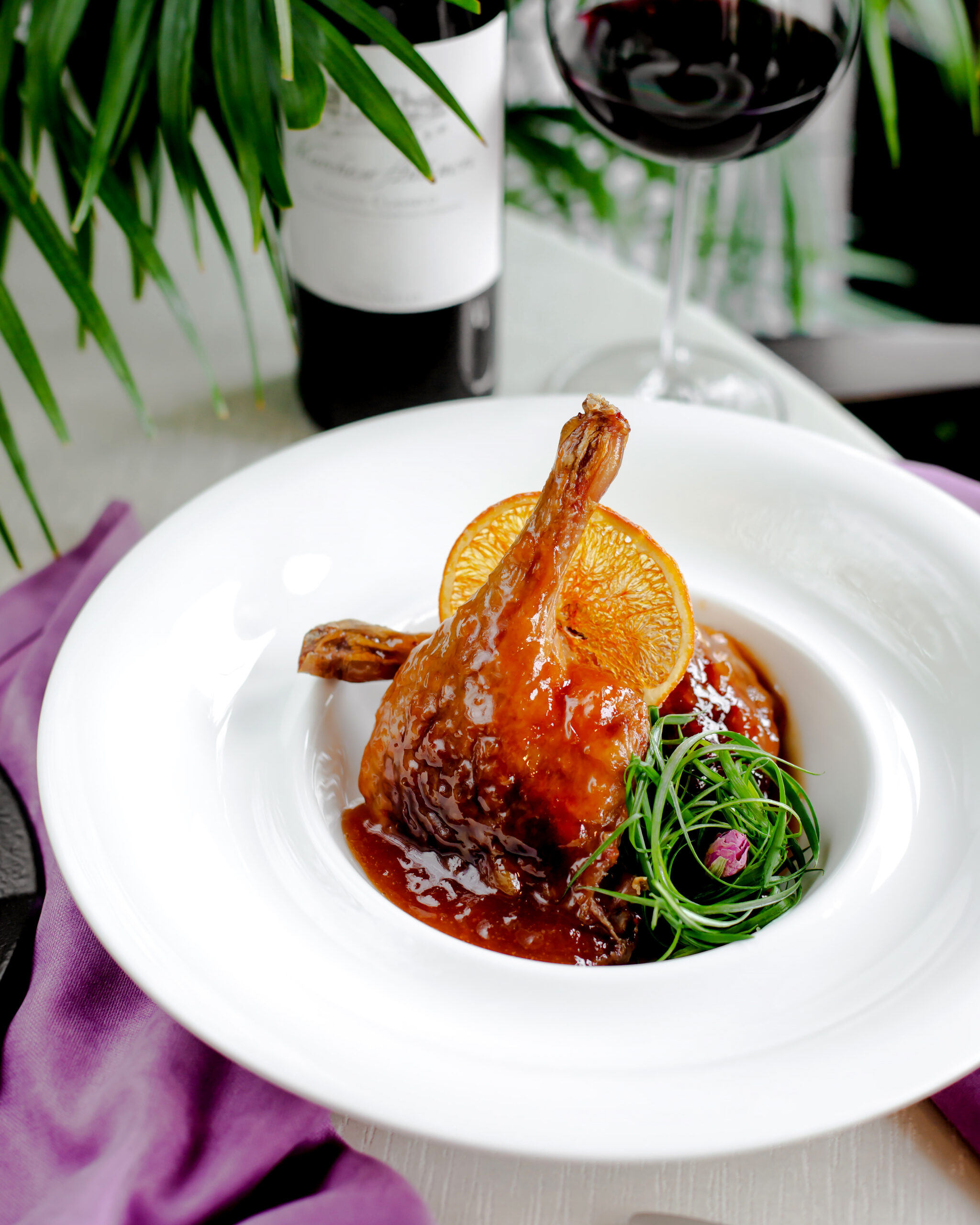 Klasikinis gurmaniškas derinys – sultinga antis ir saldžiarūgštis padažas, puikiai tinka vestuvėms ar Kalėdiniams banketams. Garnyras: perlinis kus kus, karamelizuota…