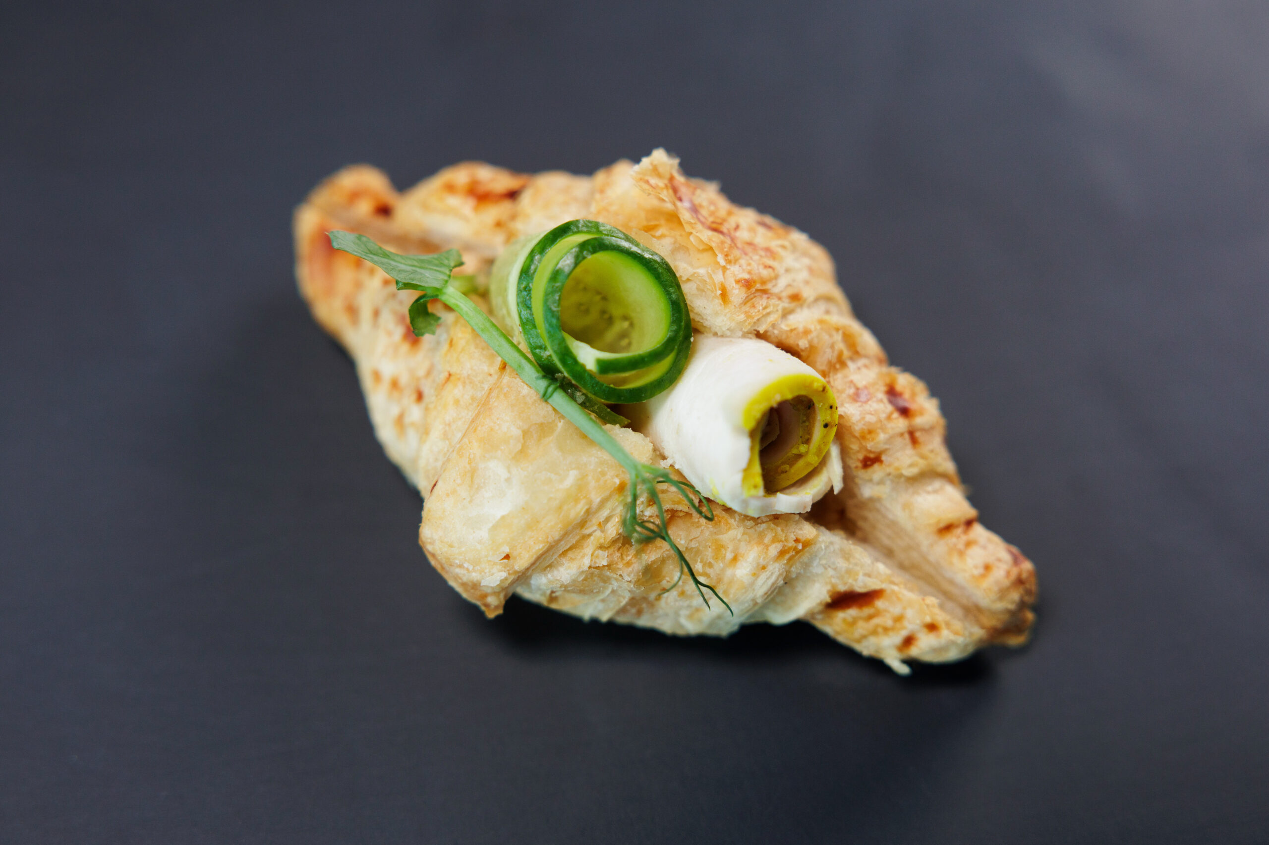 Mini sviestinis kruasanas su kepinta vištiena ir baklažanų tapenade