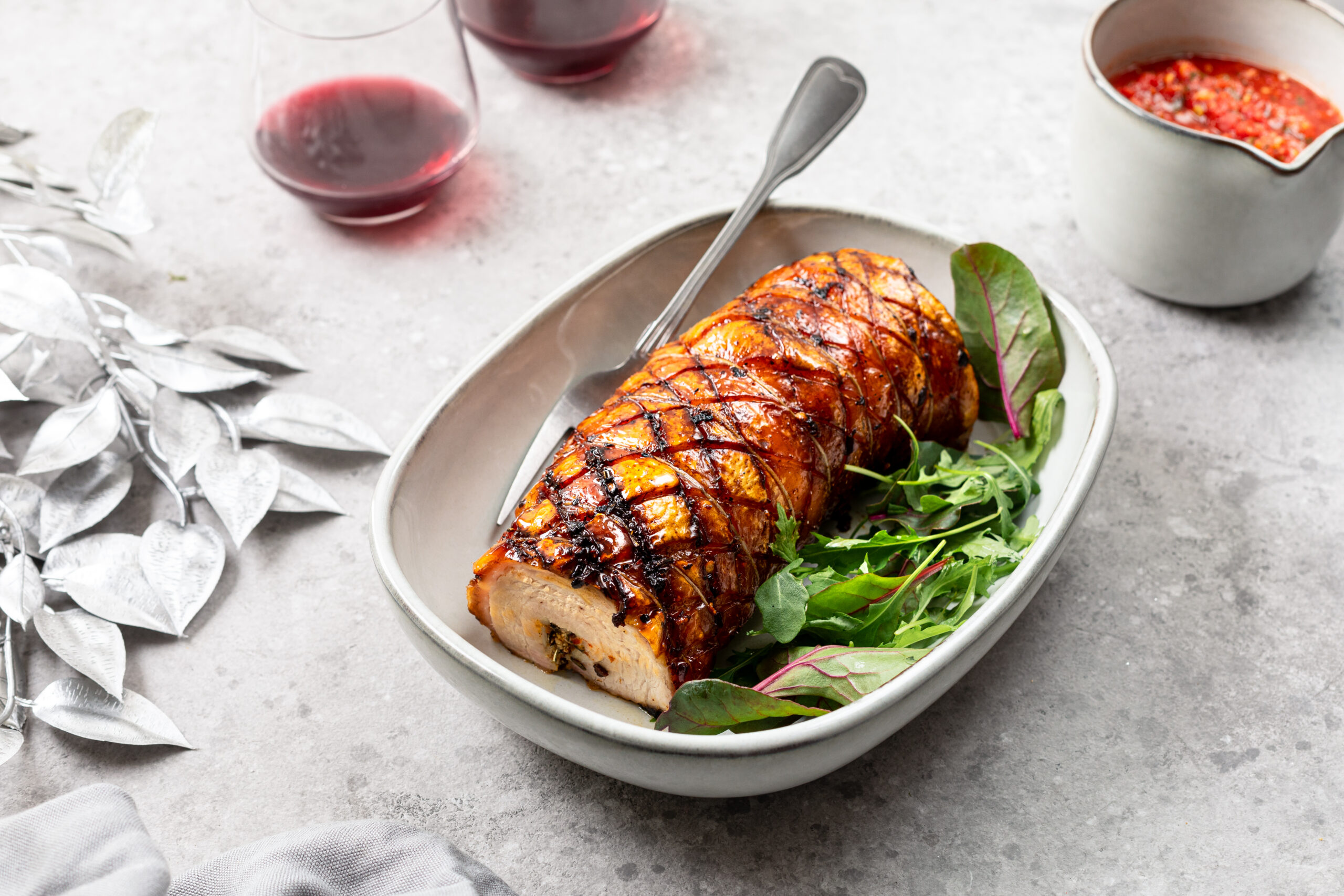 Spalvingas ir egzotiškas patiekalas – įsimintinas akcentas furšetams ar vasaros renginiams po atviru dangumi. Garnyras: moliūgų-mango-garstyčių tyre, žalios daržovės.