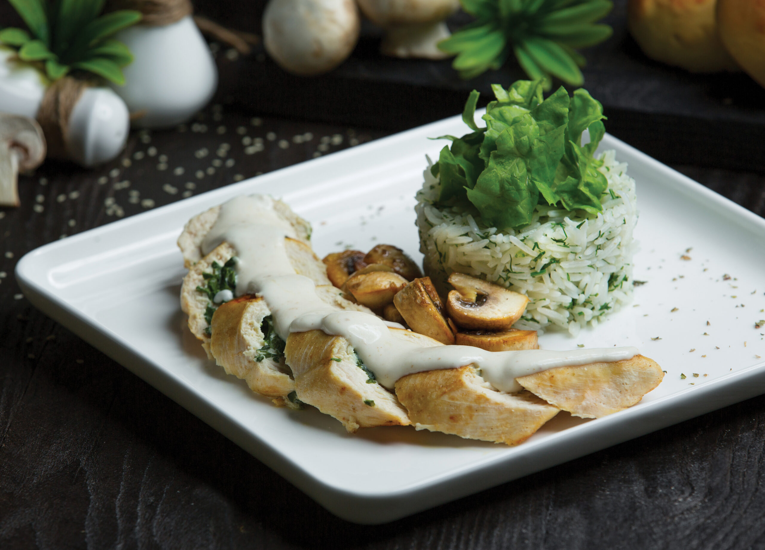 Vištiena įdaryta mocarella sūriu su voveraičių padažu